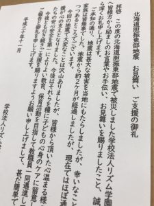 つい先日、安平町のはやきた子ども園より、理事長・園長連名でご丁寧なお礼状が届きました。